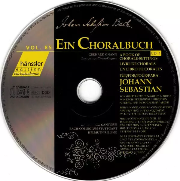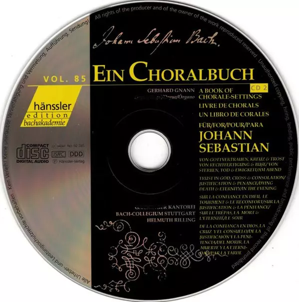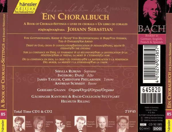 Johann Sebastian Bach: A Book Of Chorale-Setting For Johann Sebastian: Trust In God, Cross And Consolation - Justification And Penance - Dying, Death And Eternity - In The Evening versión en 2CD en estándar edición. Esta edición en concreto se lanzó en Alemania en la editorial Hänssler Classic el día 25. julio 2000. Álbum abarca todos los géneros Música clásica, Música barroca y Christmas.