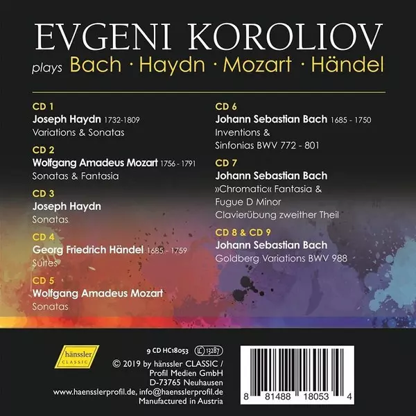 Johann Sebastian Bach: Evgeni Koroliov Plays Bach • Haydn • Mozart • Händel versión en 9CD en estándar edición. Esta edición en concreto se lanzó en Austria en la editorial Hänssler Classic el día 4. octubre 2019. Álbum abarca todos los géneros Música clásica y Música barroca.