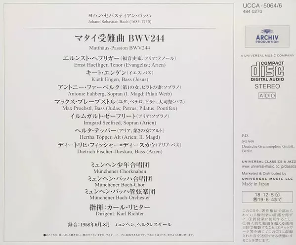 Johann Sebastian Bach: Passio Secundum Matthæum = Matthäus-Passion versión en 3CD en estándar edición. Esta edición en concreto se lanzó en Japón en la editorial Universal Music en colaboración con Archiv Produktion el día 14. diciembre 2018. Álbum puede clasificarse como género Música clásica. Shm CD.