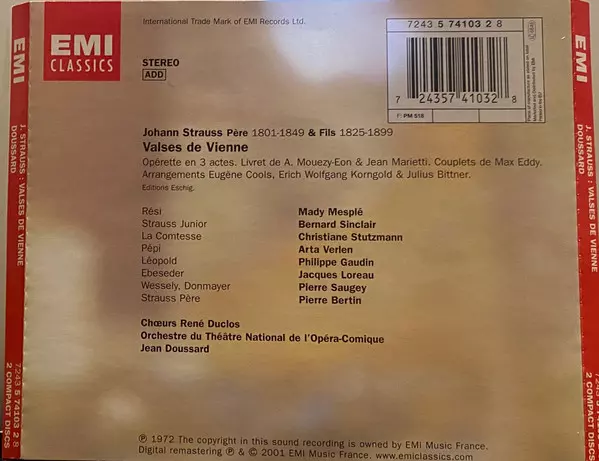 | Artista | Erich Wolfgang Korngold | Johann Strauss Jr. | Mady Mesplé | Orchestre Du Théâtre National De L'Opéra-Comique | Julius Bittner | Bernard Sinclair | Jean Doussard | Eugène Cools |