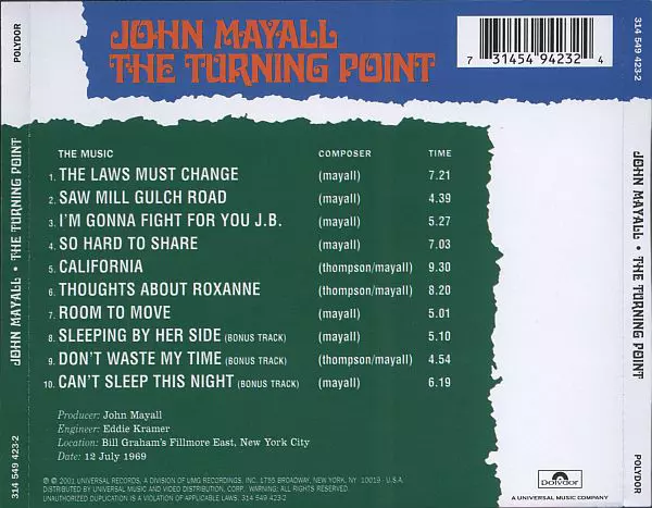 The Turning Point je živé album nahrané na koncertě ve Fillmore East Billa Grahama 12. července 1969. Toto album také představuje výrazný odklon od decibelů nasáklých, elektrifikovaných nabídek jeho dřívějších počinů a místo toho nabízí mnohem více folkový a kořenový přístup. John Almond - flétna, saxofon, alt saxofon, tenor saxofon, foukací ha...