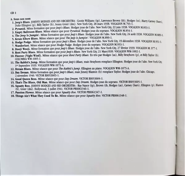 Johnny Hodges: New York - Chicago - Hollywood 1928 - 1943 versión en 2CD en estándar edición. Esta edición en concreto se lanzó en Francia en la editorial Frémeaux & Associés el día 1. abril 2015. Álbum abarca todos los géneros Jazz, Big Band, Swing y Bop.