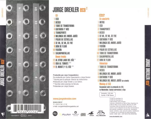 Jorge Drexler: Eco² versión en CD/DVD en estándar edición. Esta edición en concreto se lanzó en Argentína en la editorial GASA en colaboración con Warner Music Argentina el día 22. marzo 2005. Álbum abarca todos los géneros Pop y Música latina.