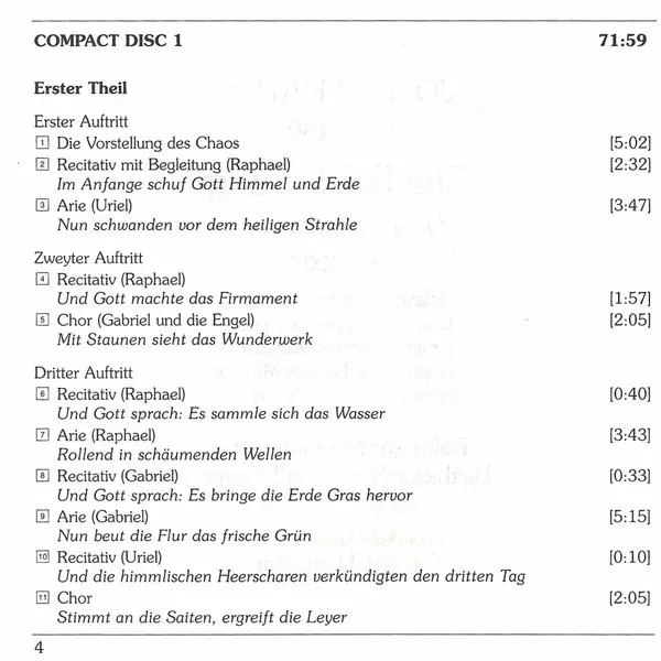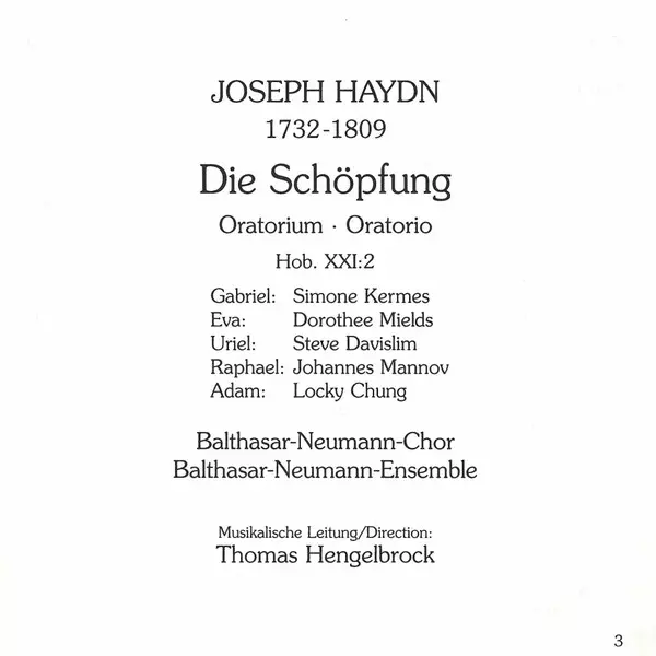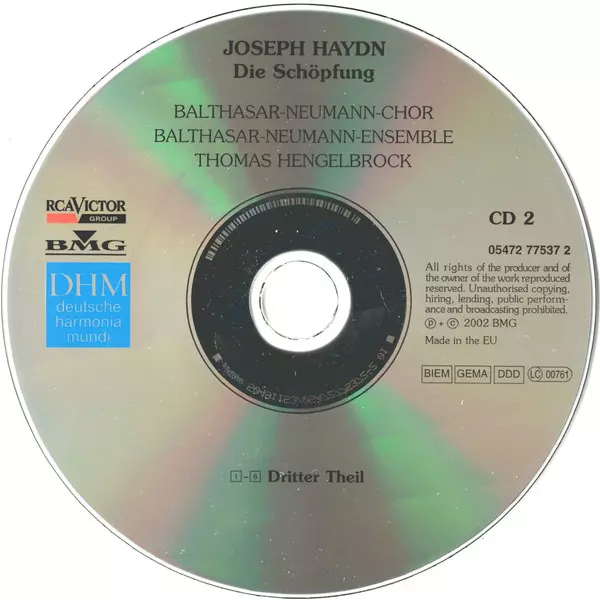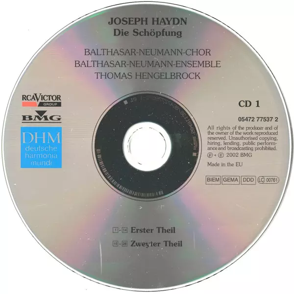 Joseph Haydn: Die Schöpfung = The Creation versión en 2CD en estándar edición. Esta edición en concreto se lanzó en Europa en la editorial deutsche harmonia mundi en colaboración con BMG y RCA Victor Group el día 20. mayo 2003. Álbum abarca todos los géneros Música clásica y Oratorio.