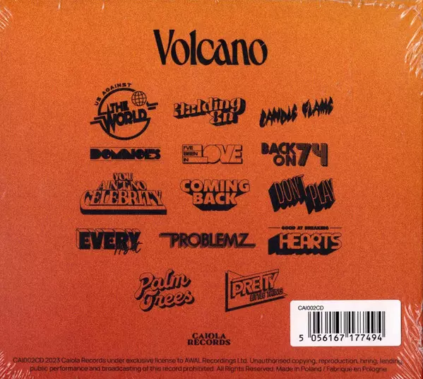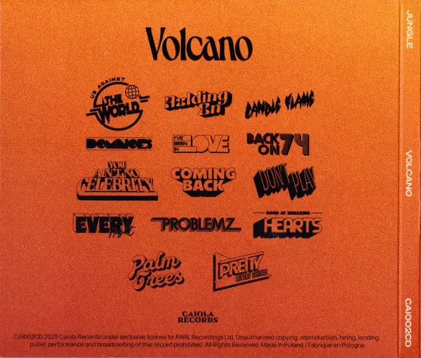 Jungle: Volcano versión en CD en estándar edición. Esta edición en concreto se lanzó en Europa en la editorial Caiola Records el día 11. agosto 2023. Álbum abarca todos los géneros Música electrónica, Funk / Soul, Neo-Soul, Nu-Disco, Pop Soul, Synth Funk y Psychedelic Soul.