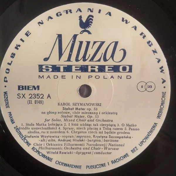 | Artista | Karol Szymanowski | The National Warsaw Philharmonic Orchestra | Stefania Woytowicz | Witold Rowicki | Andrzej Hiolski | The National Warsaw Philharmonic Orchestra Choir | Krystyna Szczepańska |