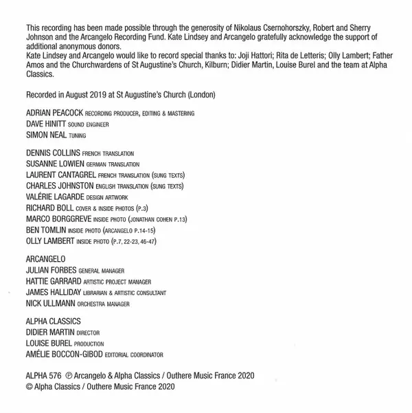 | Artista | Arcangelo | Jonathan Cohen | Kate Lindsey |