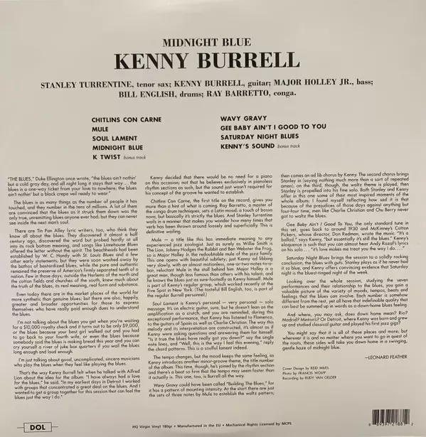 Midnight Blue z roku 1963 je považována za jednu z nejzajímavějších nahrávek dlouhé a působivé kariéry Kennyho Burrella. Díky saxofonu Stanleyho Turrentina, který každému tónu propůjčuje opojný nadbytek soulu, a kongám Raye Barretta, které bluesově laděné hudbě dodávají latinskoamerickou příchuť, Burrell rozehrává náladu a je slyšet v jeho nejvz...