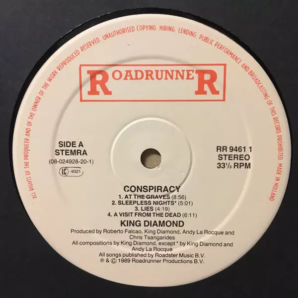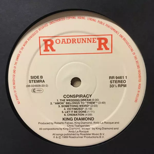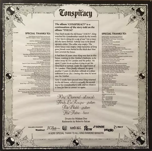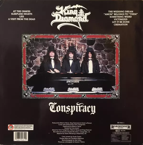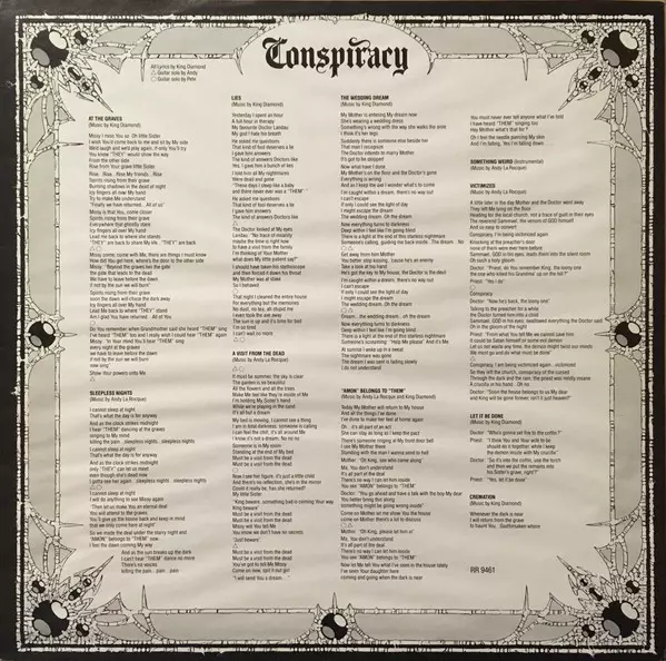 Conspiracy is the fourth studio album by Danish heavy metal band King Diamond , released on 21 June 1989. The album was recorded at Soundtrack Studios in Copenhagen, Denmark between December 1988 and April 1989. It was produced by King Diamond and Andy LaRocque. The album was mixed by LaRocque and Dan Swanö. The album tells the story of a man wh...