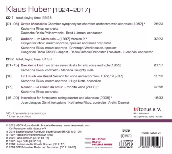 | Artista | Radio-Sinfonie-Orchester Frankfurt | Arditti Quartet | Deutsche Radio Philharmonie Saarbrücken Kaiserslautern | Magyar Rádió És Televízió Énekkara | Lucas Vis | Brad Lubman | Klaus Huber | Hugo Noth | Katharina Rikus | Christoph Werkhausen | Mariana Doughty | Jean-Jacques Dünki |