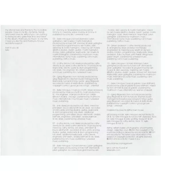 Backing Vocals Richard Stannard | Electric Piano [Rhodes] Julian Gallagher | Guitar Martin Harrington | Keyboards Ash Howes, Martin Harrington | Producer Julian Gallagher, Richard Stannard | Recorded By, Programmed By Ash Howes | Written-By Ash Howes, Julian Gallagher, Kylie Minogue, Martin Harrington, Richard Stannard