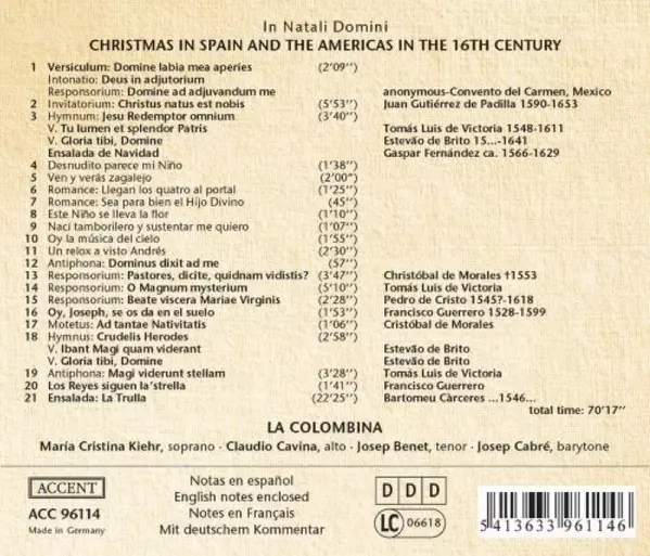 La Colombina: Christmas In Spain And The Americas In The 16th Century versión en CD en estándar edición. Esta edición en concreto se lanzó en Europa en la editorial Accent del año 1996. Álbum abarca todos los géneros Música clásica, Música barroca, Medieval y Renaissance.
