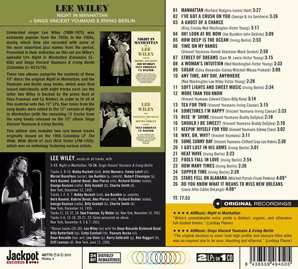 Lee Wiley: Night In Manhattan + Sings Vincent Youmans & Irving Berlin versión en CD en remasterizado edición. Esta edición en concreto se lanzó en Europa en la editorial Jackpot Records (9) el día 23. febrero 2018. Álbum abarca todos los géneros Jazz y Swing.