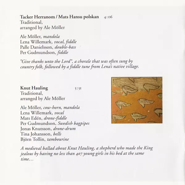 Alto Saxophone Jonas Knutsson | Arranged By Ale Möller | Composed By Traditional | Double Bass Palle Danielsson | Fiddle Mats Edén | Mandola, Flute [Drone-Flutes], Hammered Dulcimer Ale Möller | Percussion Björn Tollin, Tina Johansson | Vocals Lena Willemark