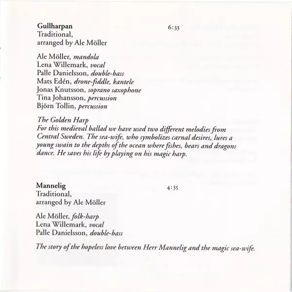 Arranged By Ale Möller | Composed By Traditional | Double Bass Palle Danielsson | Fiddle [Drone-Fiddle], Kantele Mats Edén | Mandola Ale Möller | Percussion Björn Tollin, Tina Johansson | Soprano Saxophone Jonas Knutsson | Vocals Lena Willemark