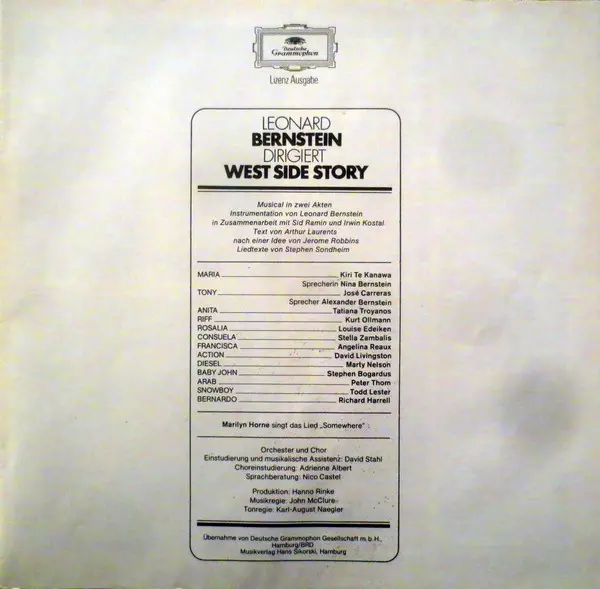 | Concept By [Nach Einer Idee von] Jerome Robbins | Lyrics By [Liedtexte], Libretto By [Libretto Copyright © 1956 By] Stephen Sondheim | Music By [Instrumentation], Libretto By [Libretto Copyright © 1956 By] Leonard Bernstein | Orchestrated By [Instrumentation in Zusammenarbeit mit] Irwin Kostal, Sid Ramin | Script By [Text], Libretto By [Libretto Copyright © 1956 By] Arthur Laurents | ||