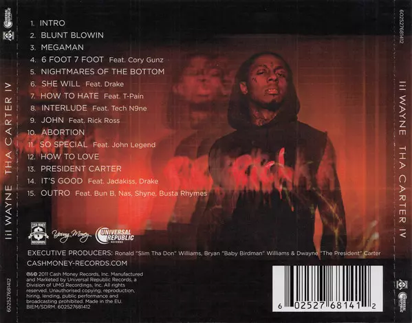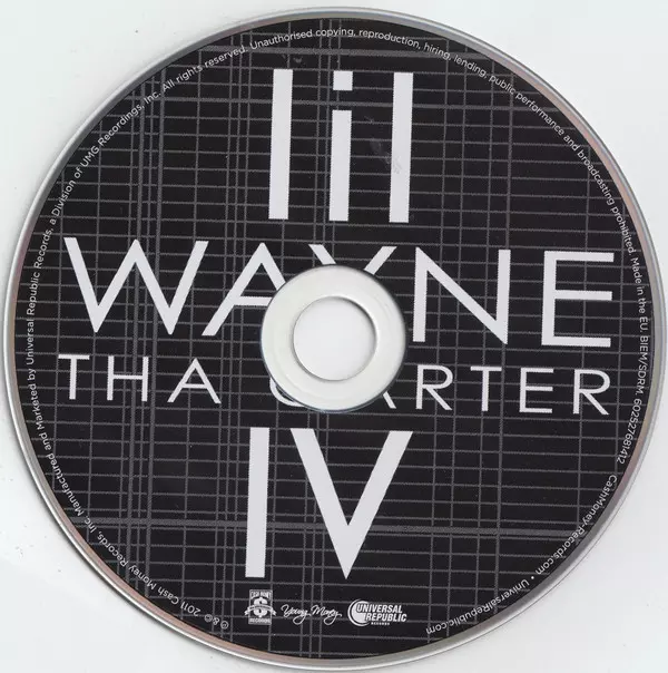 Lil Wayne: Tha Carter IV versión en CD en estándar edición. Esta edición en concreto se lanzó en Europa en la editorial Cash Money Records en colaboración con Universal Republic Records el día 29. agosto 2011. Álbum abarca todos los géneros Hip Hop y Gangsta.