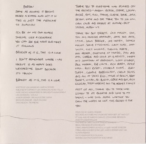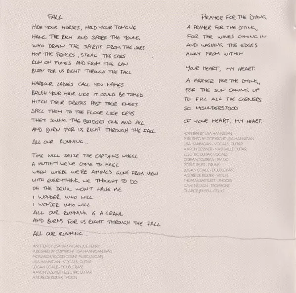 Cello Clarice Jensen | Double Bass Logan Coale | Drums Ray Rizzo | Piano, Synthesizer [OP1], Drums Aaron Dessner | Violin André de Ridder | Vocals Lisa Hannigan | Written-By Lisa Hannigan