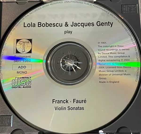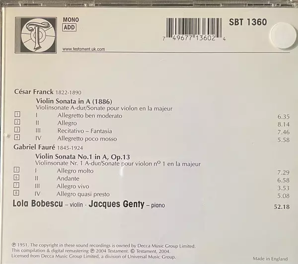 | Artista | Gabriel Fauré | César Franck | Lola Bobescu | Jacques Genty |