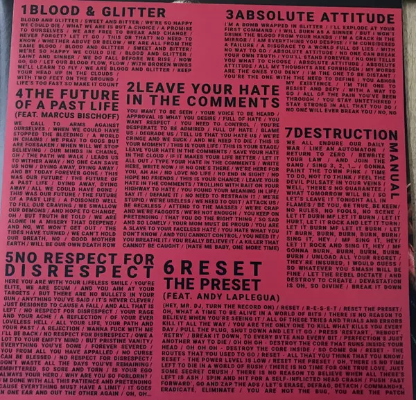 Zatímco titulní skladba "Blood & Glitter" album hned chytlavě otevírá, "Leave Your Hate In The Comments" je silným prohlášením proti bující kultuře nenávisti na sociálních sítích. V "The Future Of A Past Life" se jako první host alba objevuje zpěvák Heaven Shall Burn Marcus Bischoff. V "Reset The Preset" se objevuje Andy LaPlegua z Combichrist a v "Save Our Souls" kapelu na housle podporuje Ally Storch ze Subway To Sally. Album uzavírá "One Last Song", o níž Chris Harms říká: "Ptal jsem se sám sebe, kterou píseň bych chtěl zpívat jako poslední před smrtí, a uvědomil jsem si, že tahle píseň ještě neexistuje. Takže tady je. Pravděpodobně nejdůležitější píseň, kterou jsem kdy napsal." Jako bonus je zde coververze Roxette "The Look", v níž si jako duetový partner nevybral nikoho jiného než německou popovou hvězdu 90. let Blümchen.