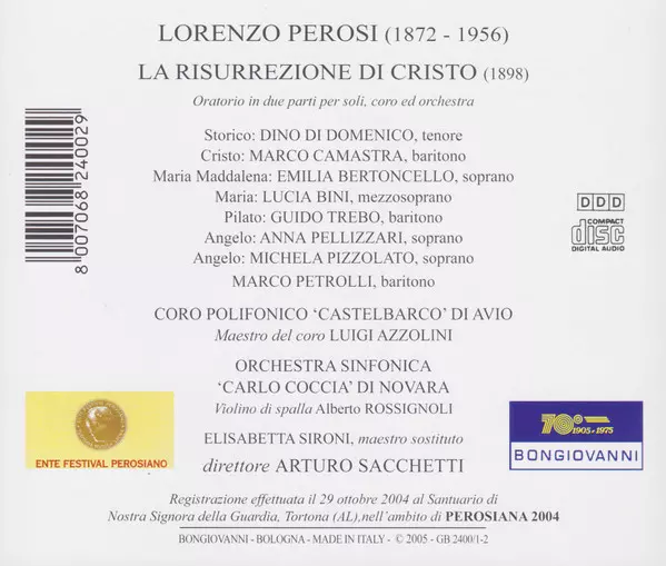 | Artista | Arturo Sacchetti | Lorenzo Perosi | Orchestra Sinfonica Carlo Coccia | Coro Polifonico Castelbarco of Avio |
