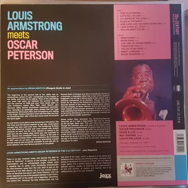 The complete classic album Louis Armstrong Meets Oscar Peterson, on which Satchmo sings and plays standards that are not part of his usual repertoire. He is masterfully accompanied here by Peterson, Herb Ellis, Ray Brown and Louis Bellson. A reissue of a jazz classic. Limited audiophile edition. DMM mastering. 180 gram Virgin Vinyl. Review , "A ...