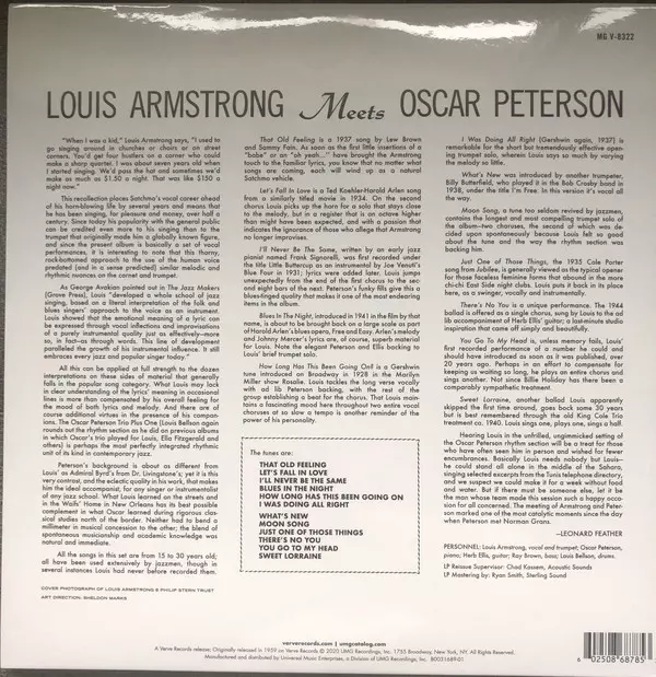 The complete classic album Louis Armstrong Meets Oscar Peterson, on which Satchmo sings and plays standards that are not part of his usual repertoire. He is masterfully accompanied here by Peterson, Herb Ellis, Ray Brown and Louis Bellson. A reissue of a jazz classic. Limited audiophile edition. DMM mastering. 180 gram Virgin Vinyl. Review , "A ...
