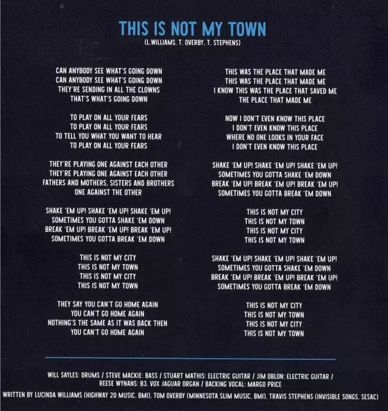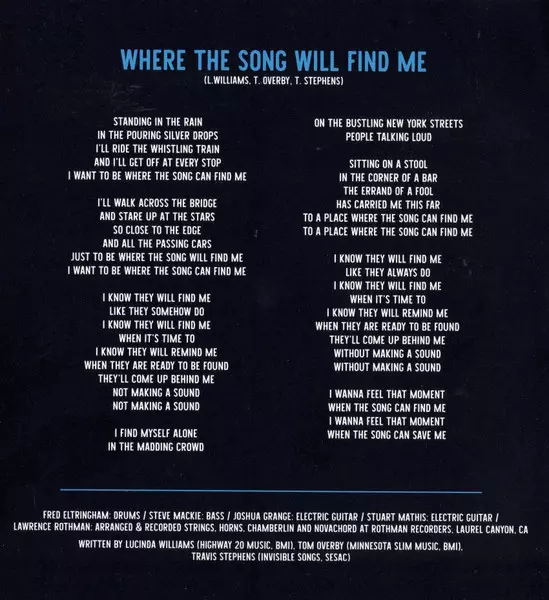 Backing Vocals Siobhan Maher-Kennedy | Bass Steve Mackey (3) | Drums Fred Eltringham | Electric Guitar Joshua Grange, Stuart Mathis | Electric Organ [B3] Reese Wynans | Written-By Lucinda Williams, Tom Overby
