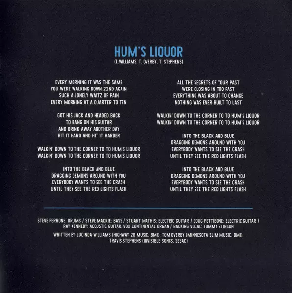 Arranged By [Strings, Horns, Chamberlin And Novachord], Recorded By [Strings, Horns, Chamberlin And Novachord] Lawrence Rothman | Bass Steve Mackey (3) | Drums Fred Eltringham | Electric Guitar Joshua Grange, Stuart Mathis | Written-By Lucinda Williams, Tom Overby, Travis Stephens