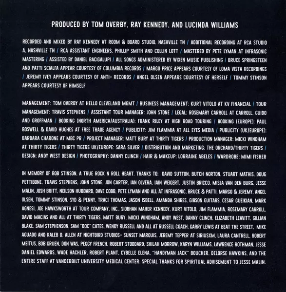 Backing Vocals Margo Price | Bass Steve Mackey (3) | Drums Will Sayles | Electric Guitar Jim Oblon, Stuart Mathis | Electric Organ [B3], Electric Organ [Vox Jaguar] Reese Wynans | Written-By Lucinda Williams, Tom Overby, Travis Stephens