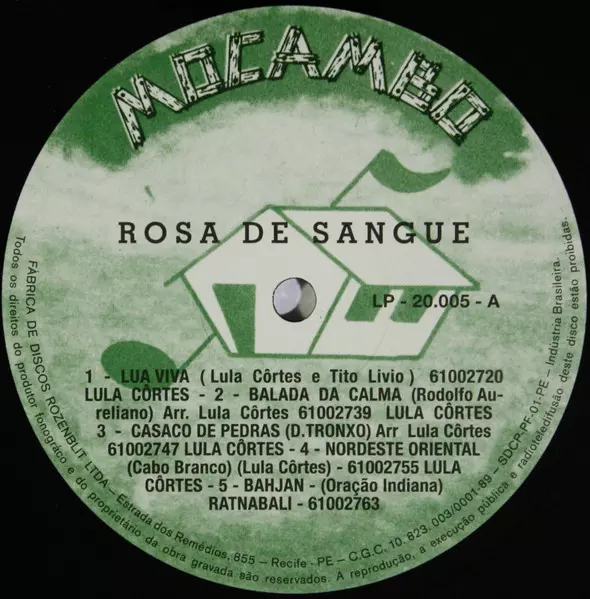 Lula Côrtes: Rosa De Sangue versión en vinilo LP en estándar edición. Esta edición en concreto se lanzó en Reino Unido en la editorial Mr Bongo el día 14. junio 2013. Álbum abarca todos los géneros Rock, Pop, Música latina y Psychedelic rock.