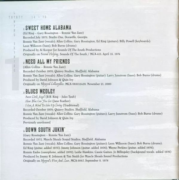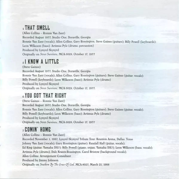 Backing Vocals Cassie Gaines, Jo Billingsley, Leslie Hawkins | Bass Leon Wilkeson | Drums Bob Burns (2) | Guitar Allen Collins, Ed King (2), Jimmy Johnson (4), Wayne Perkins | Producer Jimmy Johnson (4), Tim Smith (2) | Saxophone Ronald Eades | Written-By, Guitar Gary Rossington | Written-By, Vocals Ronnie Van Zant