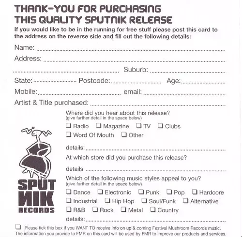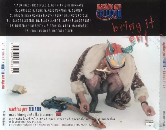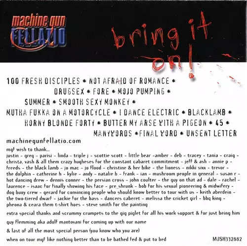 Machine Gun Fellatio: Bring It On! versión en CD en estándar edición. Esta edición en concreto se lanzó en Australia en la editorial Sputnik Records el día 18. octubre 2004. Álbum abarca todos los géneros Rock, Música electrónica, Alternative rock y Electro.