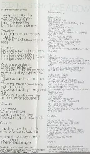 The album Bedtime Stories, released in 1994 on Madonna , was a departure from her earlier pop music albums. The album, which featured a sound influenced more by R&B and hip-hop, was commercially successful and debuted at number one on the Billboard 200. Singles from the album such as "Secret" and "Take a Bow" became chart hits and the album was ...