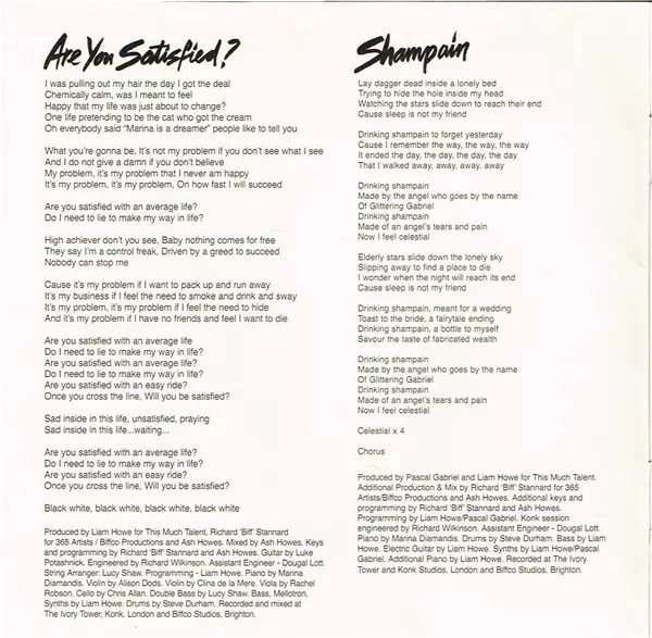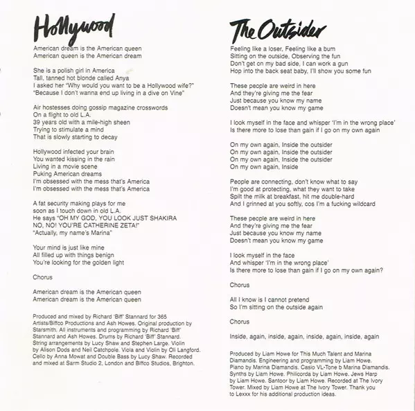 Arranged By [String Arrangements] Lucy Shaw, Stephen Large | Cello Anna Mowat | Double Bass Lucy Shaw | Drums Richard Stannard | Instruments [All Instruments], Programmed By [Programming] Ash Howes, Richard Stannard | Producer [Original Production] Starsmith | Producer, Mixed By Ash Howes, Richard Stannard | Viola, Violin Oliver Langford | Violin Alison Dods, Nell Catchpole | Written-By Marina Diamandis