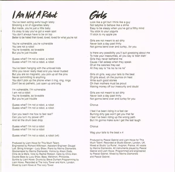Engineer [Engineering], Programmed By [Programming] Liam Howe | Jew's Harp [Jews Harp] Liam Howe | Keyboards [Philicorda] Liam Howe | Mixed By Liam Howe | Piano Marina Diamandis | Producer Liam Howe, Marina Diamandis | Producer [Thank You For His Additional Production Ideas] Lexxx | Santoor Liam Howe | Synthesizer [Casio VL-tone B] Marina Diamandis | Synthesizer [Synths] Liam Howe | Written-By Marina Diamandis