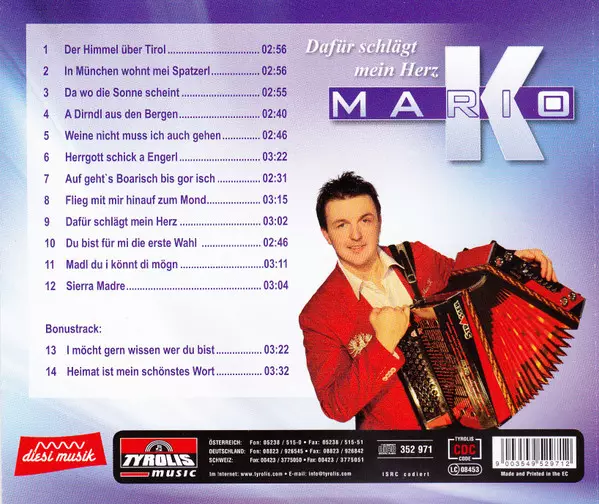 Mario Karnahsnigg: Dafür Schlägt Mein Herz versión en CD en estándar edición. Esta edición en concreto se lanzó en Alemania, Austria y Suiza en la editorial Diesi Musik en colaboración con Tyrolis Music el día 13. mayo 2014. Álbum abarca todos los géneros Pop, Folk, World, & Country, Schlager y Volksmusik.