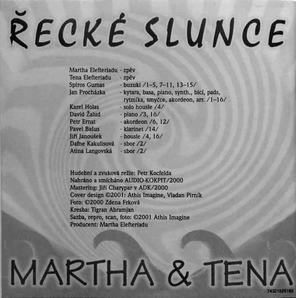 Martha A Tena Elefteriadu: Řecké Slunce versión en CD en estándar edición. Esta edición en concreto se lanzó en República Checa en la editorial Ariola en colaboración con BMG Ariola ČR del año 2001. Álbum abarca todos los géneros Pop, Folk, World, & Country, Balad, Folk, Chanson y Rebetiko.