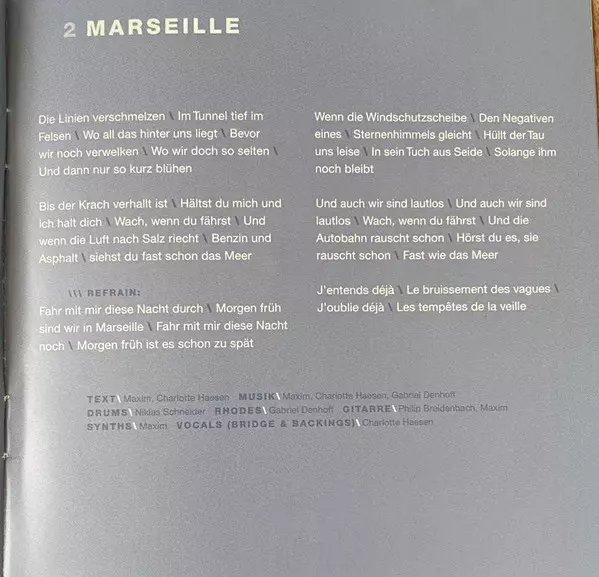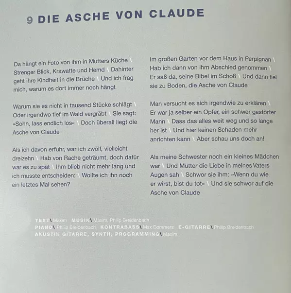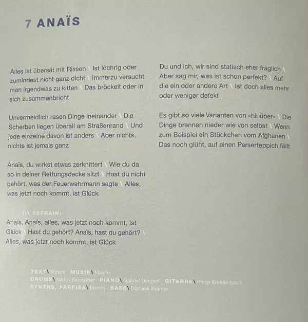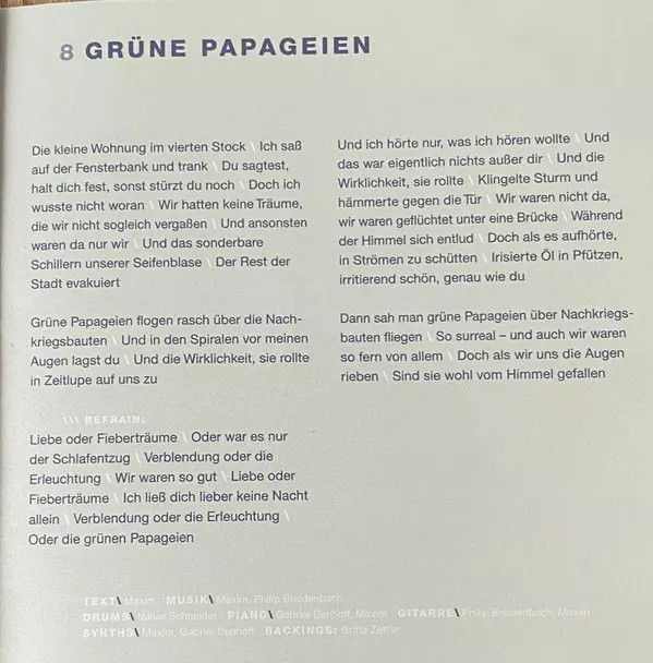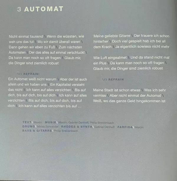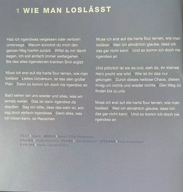 Backing Vocals Britta Zettler | Drums Niklas Schneider | Guitar Maxim (3), Philip Breidenbach | Music By Philip Breidenbach | Music By, Lyrics By Maxim (3) | Piano Gabriel Denhoff, Maxim (3) | Synth Gabriel Denhoff, Maxim (3)