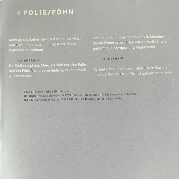 Bass Christopher Martin (4) | Drums Niklas Schneider | Guitar Maxim (3), Philip Breidenbach | Keyboards Maxim (3) | Music By, Lyrics By Maxim (3) | Trombone, Flugelhorn Til Schneider