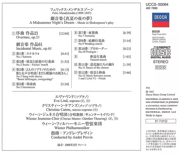 | Artista | Wiener Philharmoniker | André Previn | Felix Mendelssohn-Bartholdy | Eva Lind | Wiener Jeunesse-Chor | Christine Cairns |