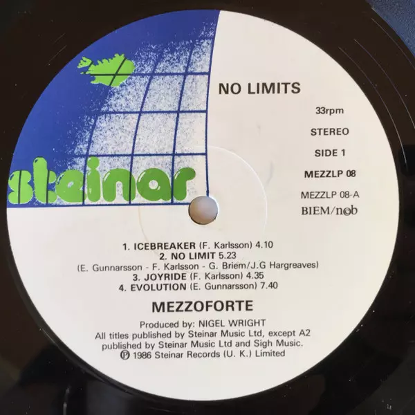 Mezzoforte: No Limits versión en vinilo LP en estándar edición. Esta edición en concreto se lanzó en Escandinavia en la editorial Steinar en colaboración con Funkin' Marvellous Records del año 1986. Álbum abarca todos los géneros Música electrónica, Jazz, Jazz-Funk y Jazzdance.