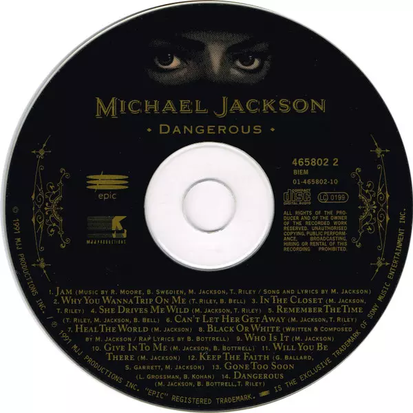 Michael Jackson: Dangerous versión en CD en estándar edición. Esta edición en concreto se lanzó en Europa en la editorial Epic en colaboración con MJJ Productions del año 1991.