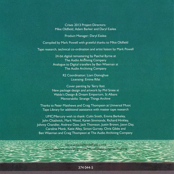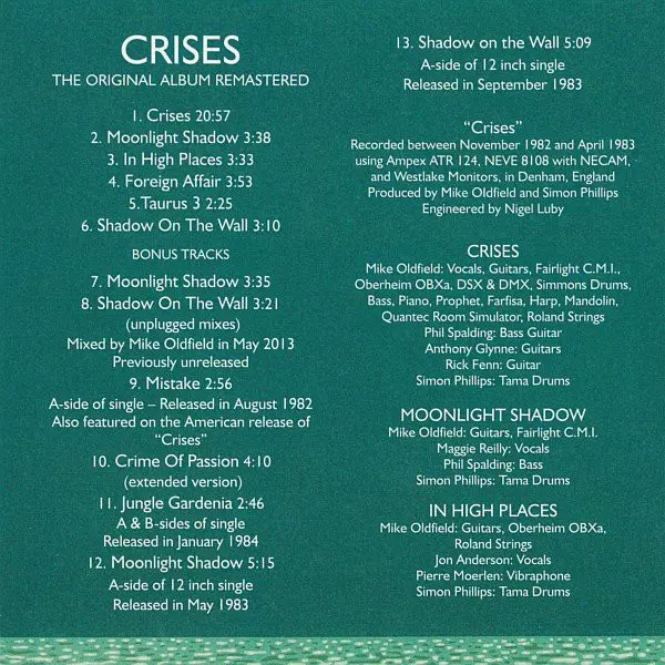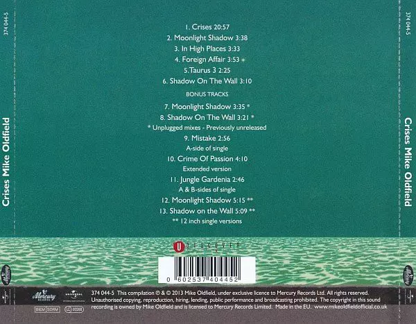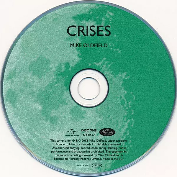 Mike Oldfield: Crises versión en CD en remasterizado edición. Esta edición en concreto se lanzó en Europa en la editorial Mercury en colaboración con Universal Music Catalogue el día 10. septiembre 2013.