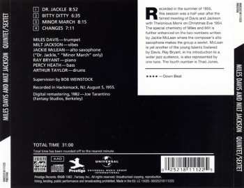 The recording was made in the summer of 1955, six months after Davis and Jackson's famous meeting with Thelonious Monk on Christmas Eve 1954. Miles and Milt's special chemistry is enhanced in two numbers written by Jackie McLean, where the composer's alto sax makes the group a sextet. McLean is another of the young talents that Davis encouraged....