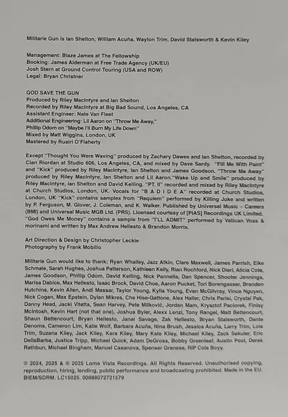 Militarie Gun: God Save The Gun CLR | LTD versión en vinilo LP en en color de edición limitada edición. Esta edición en concreto se lanzó en Europa en la editorial Loma Vista el día 17. octubre 2025. Álbum abarca todos los géneros Rock, Indie Rock, Hardcore y Post-Hardcore. Coloured Translucent Red Vinyl Limited Edition.