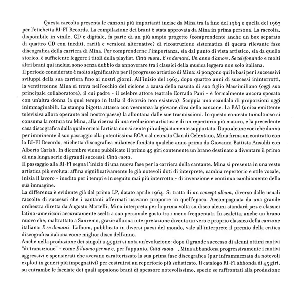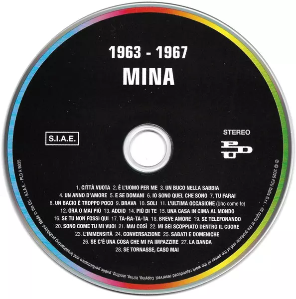 Mina: 1963 - 1967 Mina versión en CD en remasterizado edición. Esta edición en concreto se lanzó en Italia en la editorial PDU el día 14. noviembre 2025. Álbum abarca todos los géneros Pop, Vocal y Chanson.