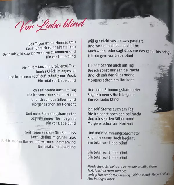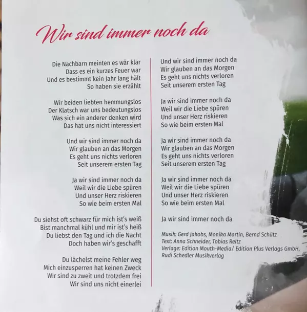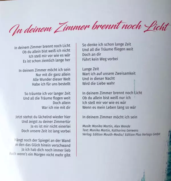 Arranged By Christian Maier (2), Domenico Livrano, Gerd Jakobs, Thorsten Willig | Guitar Holger Quak, Mats Björklund | Lyrics By Anna Schneider (2), Tobias Reitz | Music By Bernd Schütz, Gerd Jakobs, Monika Martin | Producer GEDO, Monika Martin