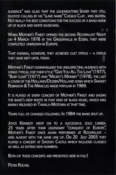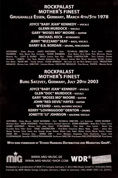Mother's Finest: Live At Rockpalast 1978 + 2003 versión en DVD en estándar edición. Esta edición en concreto se lanzó en Alemania en la editorial MIG el día 8. septiembre 2023. Álbum abarca todos los géneros Rock y Funk / Soul.