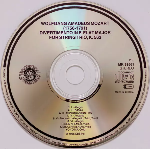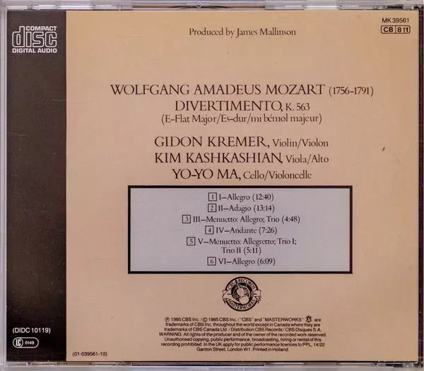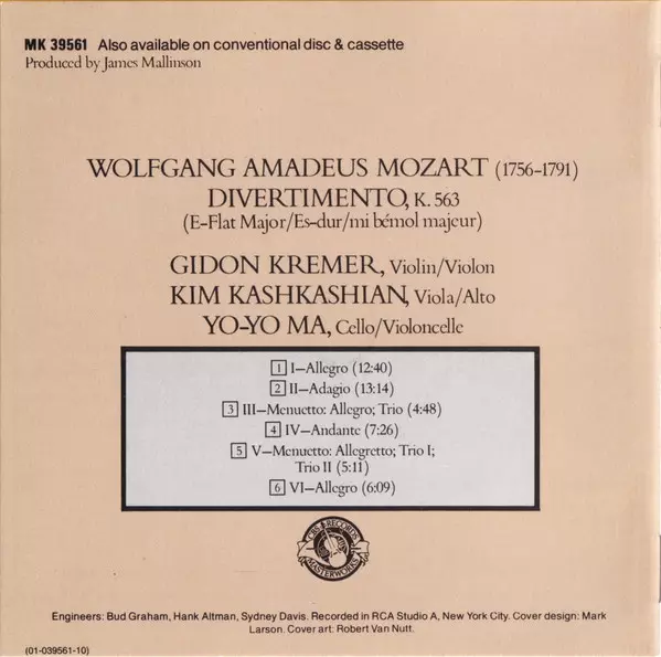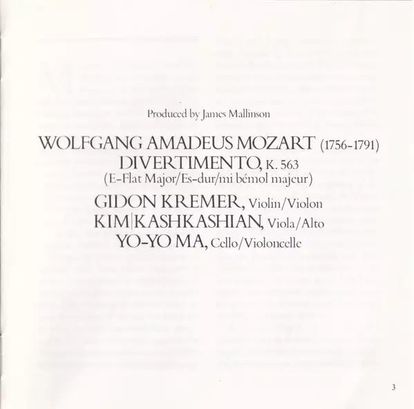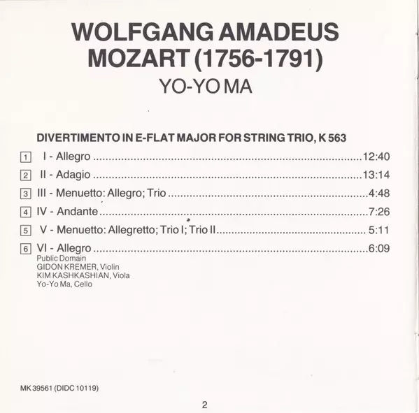 | Artista | Wolfgang Amadeus Mozart | Yo-Yo Ma | Gidon Kremer | Kim Kashkashian |